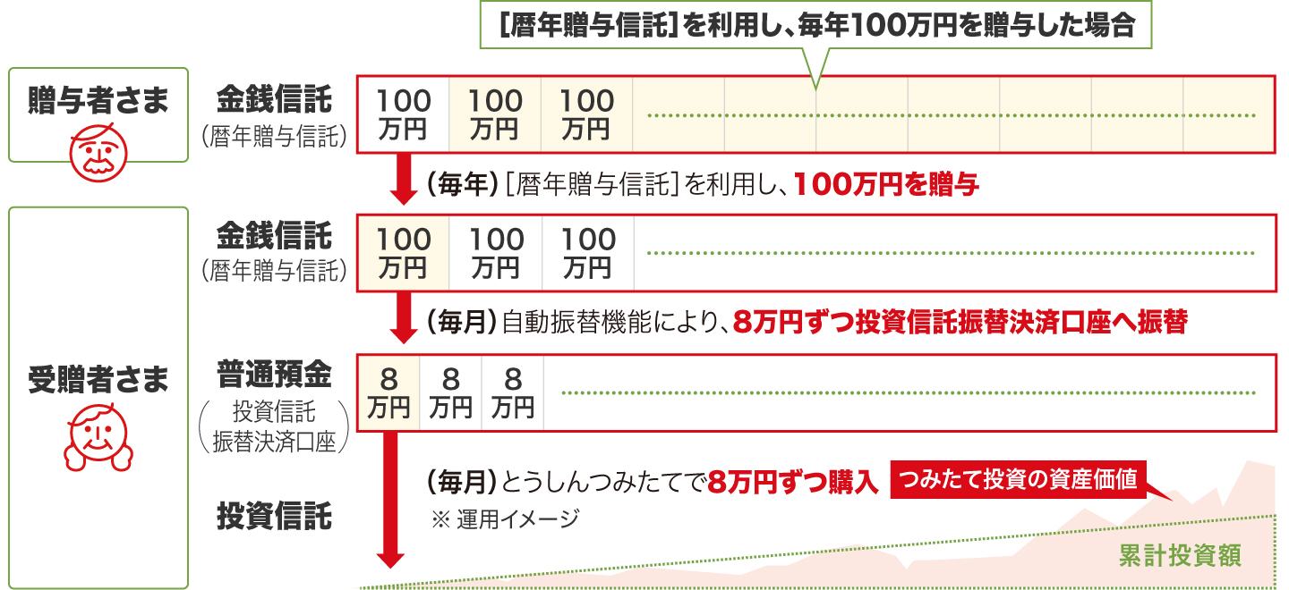 受贈者さまが 「とうしんつみたて」を利用し、毎月一定額を投資信託で積立することで、