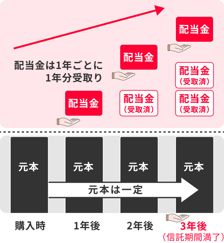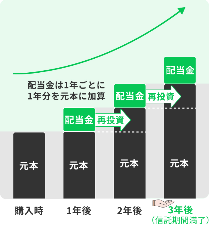 計算期日(1年)ごとに計算期間(1年分)の配当金を元本に加算する方法です。複利効果により、より大きな利益を得ることができます。元本・配当金は、信託期間満了後に一括でお受取りいただきます