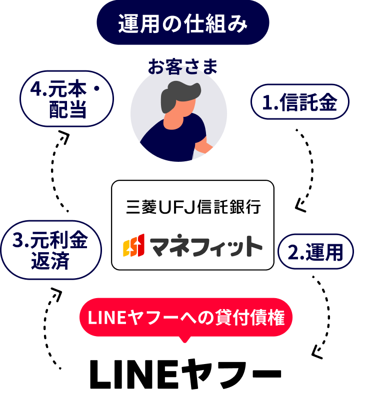 マネフィットは、お客さまからお預かりした資産を商品に応じた各種債権に投資して運用し、元本と収益をお返しする仕組みです
